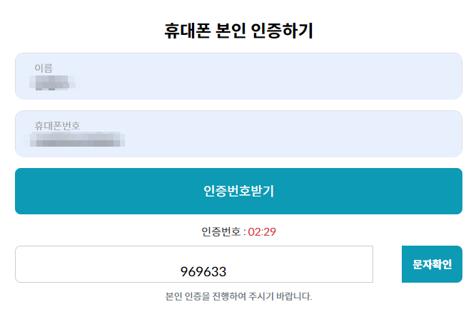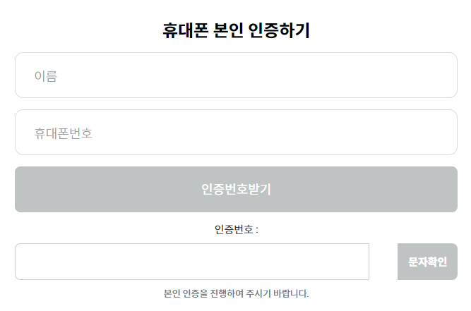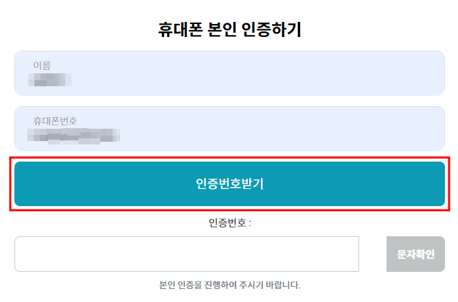 ▶ 간단히 본인 이름과 휴대폰 번호를 입력하신 후 인증번호받기 버튼을 클릭해주시면 됩니다.