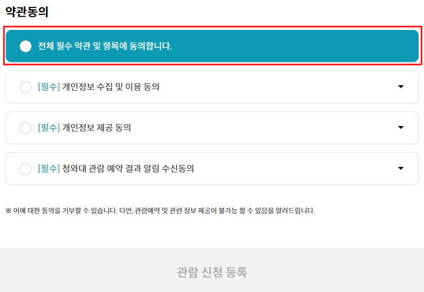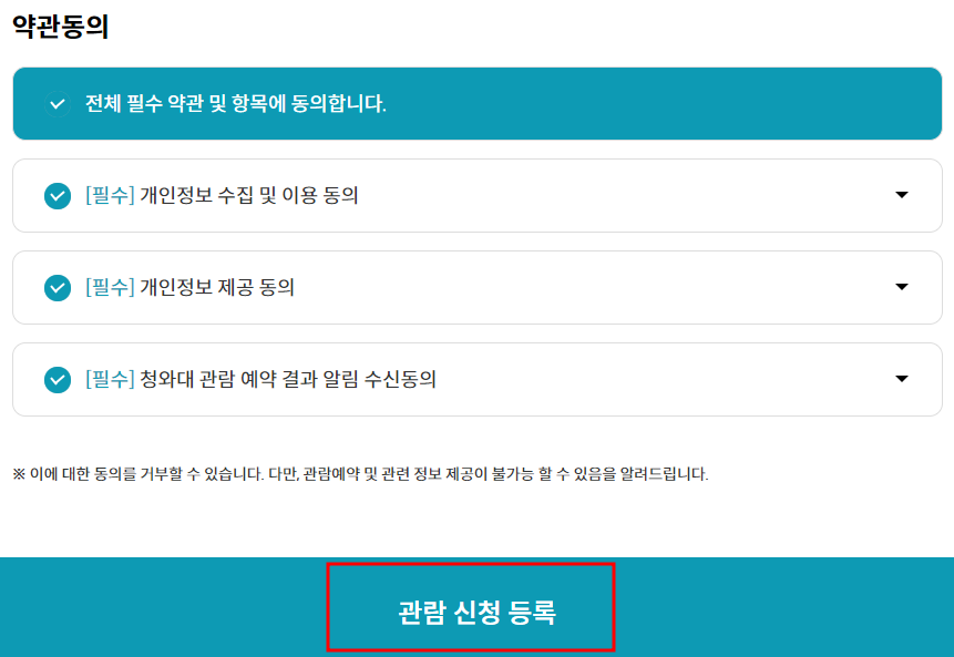 ▶ 약관동의에 체크하신 후 관림 신청 등록 버튼을 클릭해주시면 관람 예약이 완료됩니다.