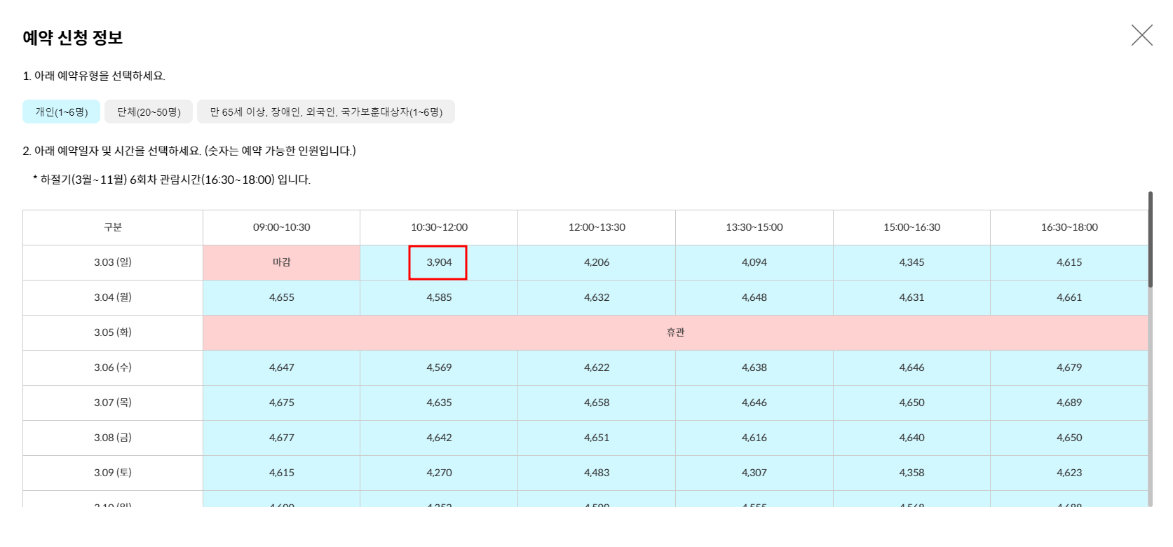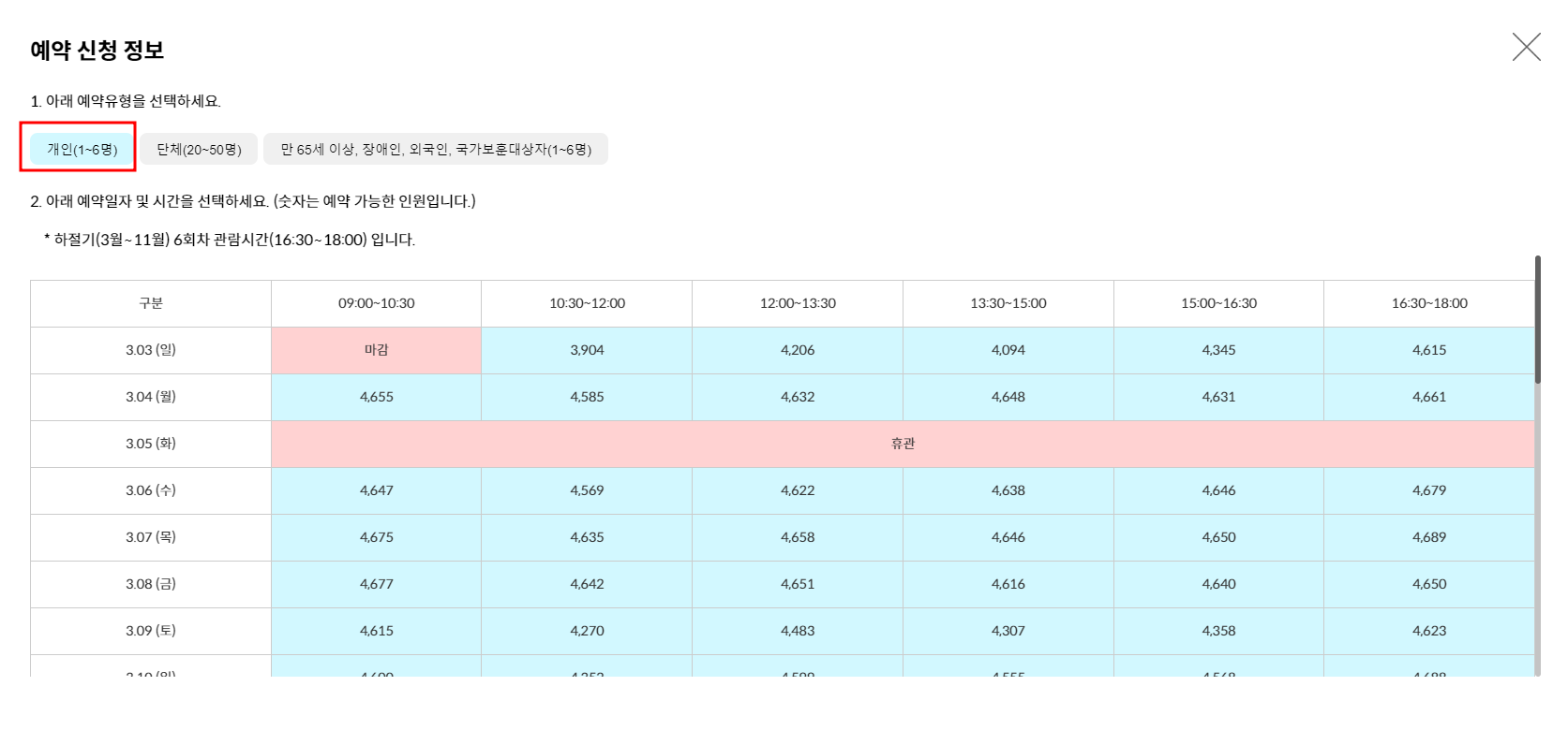 ▶ 예약일정 및 시간을 클릭해주시면 '예약 신청 정보'에 방금 선택하신 일정 및 시간이 표시됩니다. 관람예약인원을 추가로 선택해주시면 됩니다. (개인은 최대 6명까지 예약이 가능합니다.)