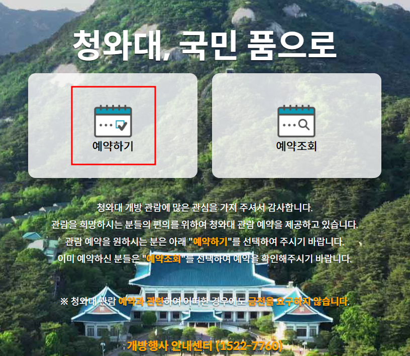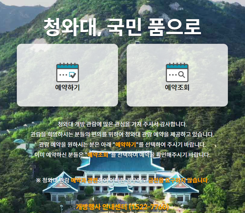 또한, 청와대 관람은 단순한 방문이 아닌, 대한민국의 깊은 역사와 문화를 체험하실 수 있는 특별한 추억을 만들어줄 시간이 될 것입니다. 지금 바로 '청와대 관람 예약하기' 를 클릭하시고, 잊지 못할 추억을 만들 준비를 시작해보세요.