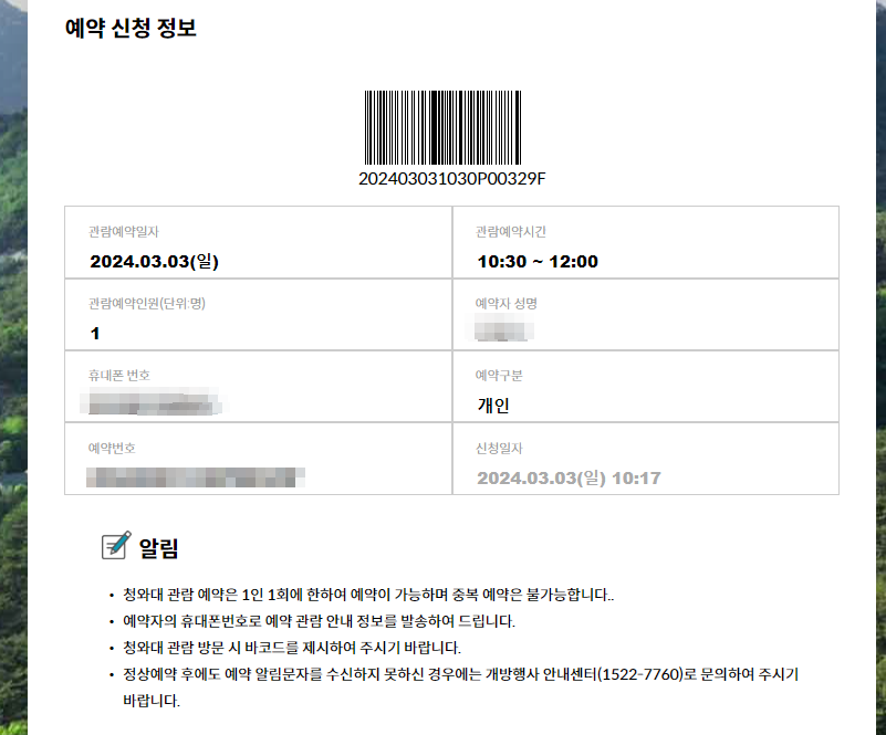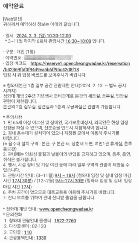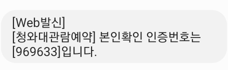 ▶ 관람신청 등록이 끝나면, 등록하신 휴대폰으로 청와대 관람 신청 등록완료 문자를 받게 됩니다.