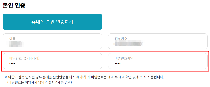 ▶ 본인 인증을 하시게 되면 이름 및 전화번호가 등록되며, 비밀번호를 입력해주시면 됩니다.