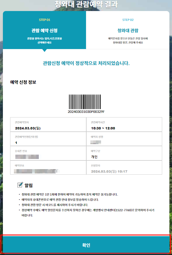 ▶ 예약 신청 정보를 확인하신 후 하단에 확인 버튼을 클릭해주시면 관람 예약이 마무리됩니다.